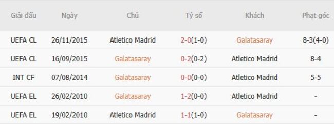 Thành tích đối đầu quá khứ giữa Galatasaray vs Atletico Madrid
