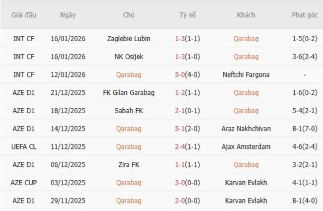 Trên mọi đấu trường, sáu trận gần nhất của Qarabag có ba chiến thắng, một trận hòa và hai trận thua, ghi được 14 bàn thắng và để thủng lưới 9 bàn, trong khi phong độ trên sân nhà ở Baku vẫn là một điểm mạnh nổi bật với lối chơi tấn công mạnh mẽ và khả năng kiểm soát thế trận. Trước đây, Qarabag đã từng đối đầu với Eintracht Frankfurt hai lần trong lịch sử tại vòng loại Europa League năm 2013, khi đội bóng Đức giành quyền đi tiếp với tổng tỷ số 4-1 sau hai trận thắng 2-0 và 2-1.