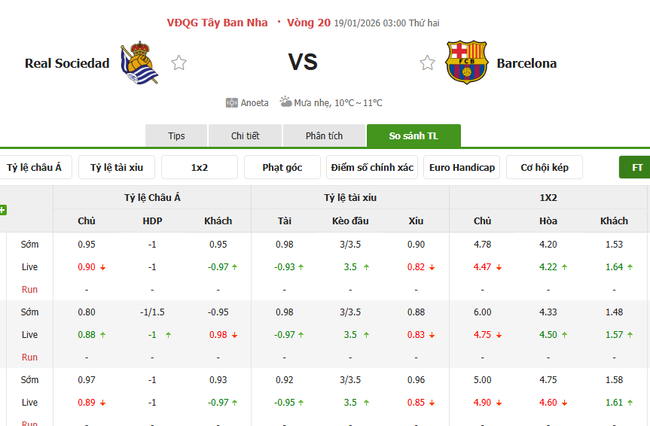 Tỷ lệ kèo Real Sociedad vs Barcelona